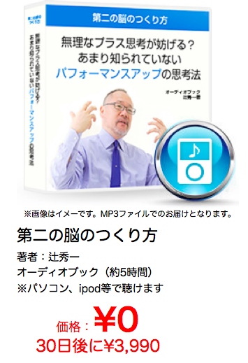 価格はたったの3990円(税別、MP3音声データダウンロード)です。この「第二の脳のつくり方」のオーディオブックはプライベート販売のため、今このページでしか買うことができません。書店では売っていませんし、アマゾンでも売っていません。